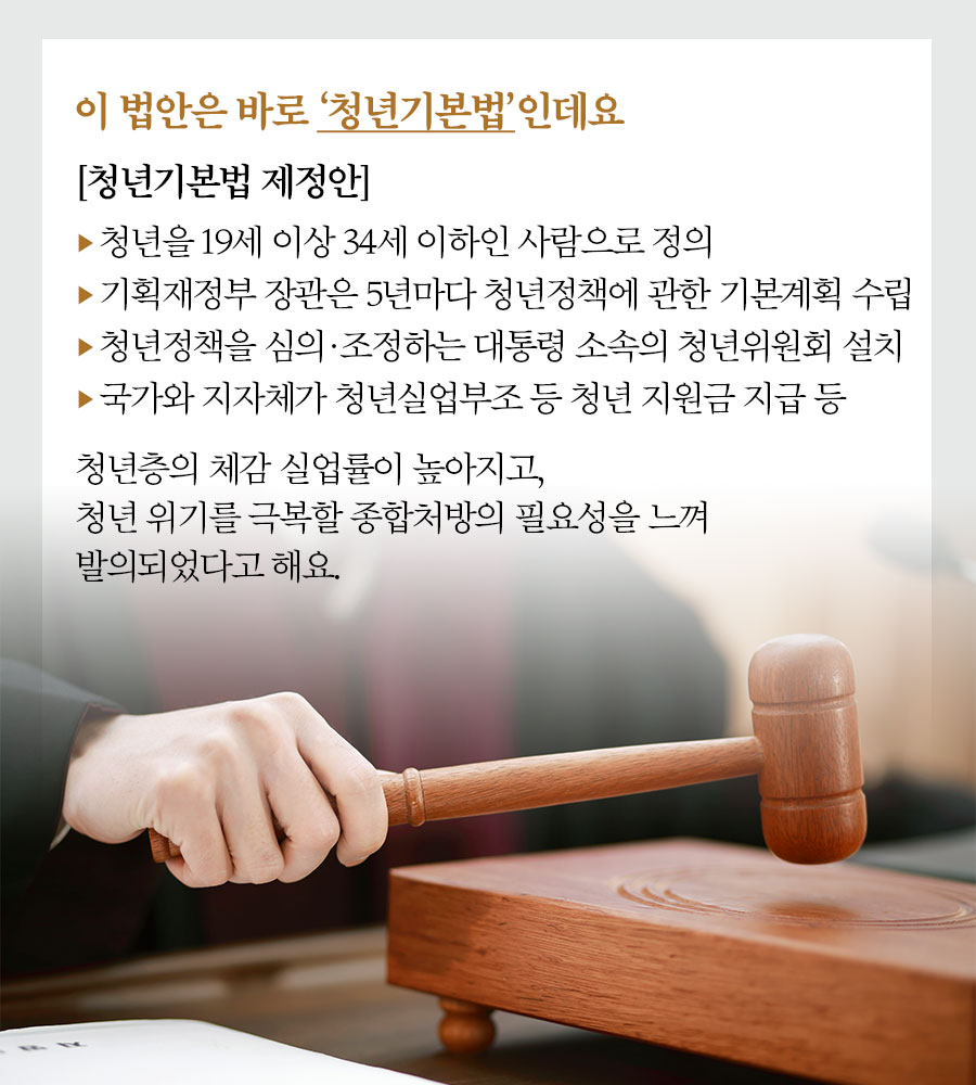 청년위기를 극복할 종합처방의 필요성을 느껴 발의되었다고 해요.