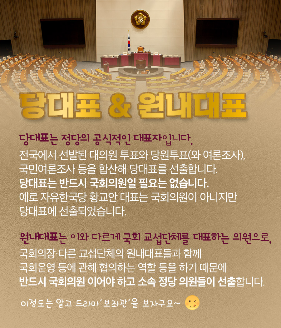 원내대표는 이와 다르게 국회 교섭단체를 대표하는 의원으로,