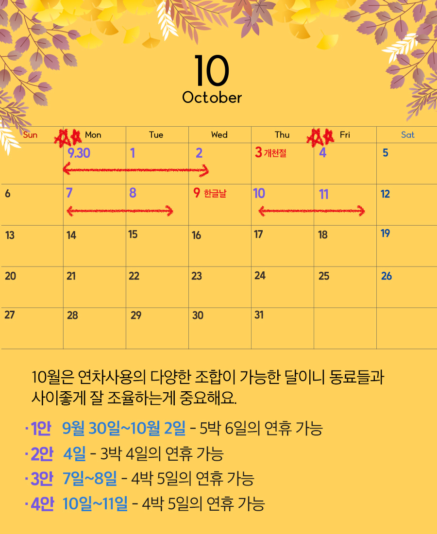 10월은 연차사용의 다양한 조합이 가능한 달이니 동료들과 사이좋게 잘 조율하는게 중요하답니다.