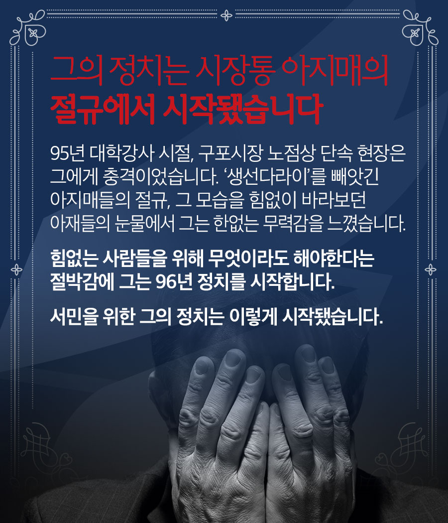그의 정치는 시장통 아지매의 절규에서 시작됐습니다.
