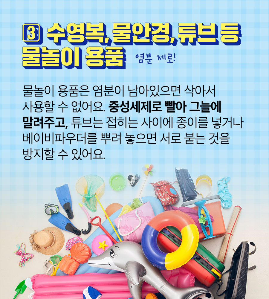 3) 수영복, 물안경, 튜브 등 물놀이 용품 염분 제로!