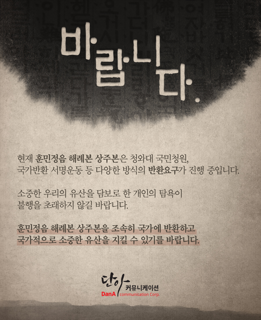 훈민정음 해례본 상주본을 조속히 국가에 반환하고 국가적으로 소중한 유산을 지킬 수 있기를 바랍니다.