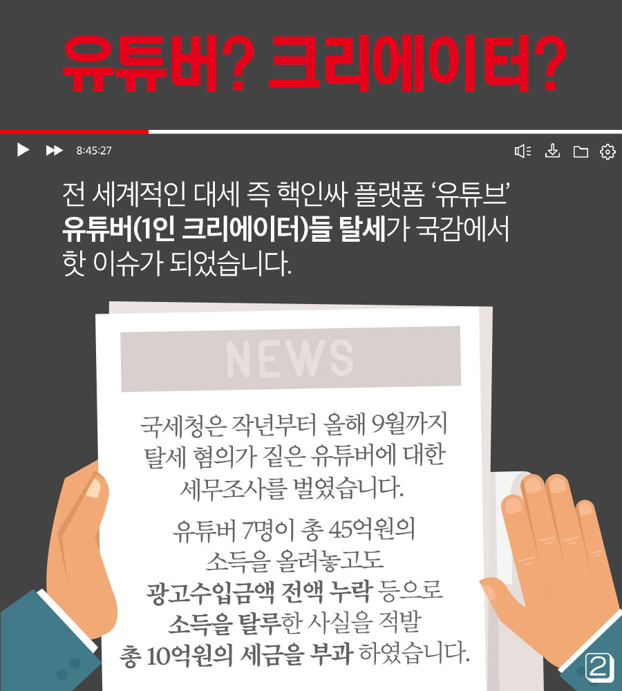 유튜버(= 1인 크리에이터)들 탈세가 국감에서 핫 이슈가 되었습니다.
