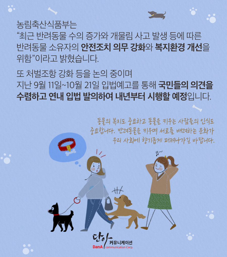 반려동물 소유자의 안전조치 의무 강화와 복지환경 개선을 위함“이라고 밝혔습니다.