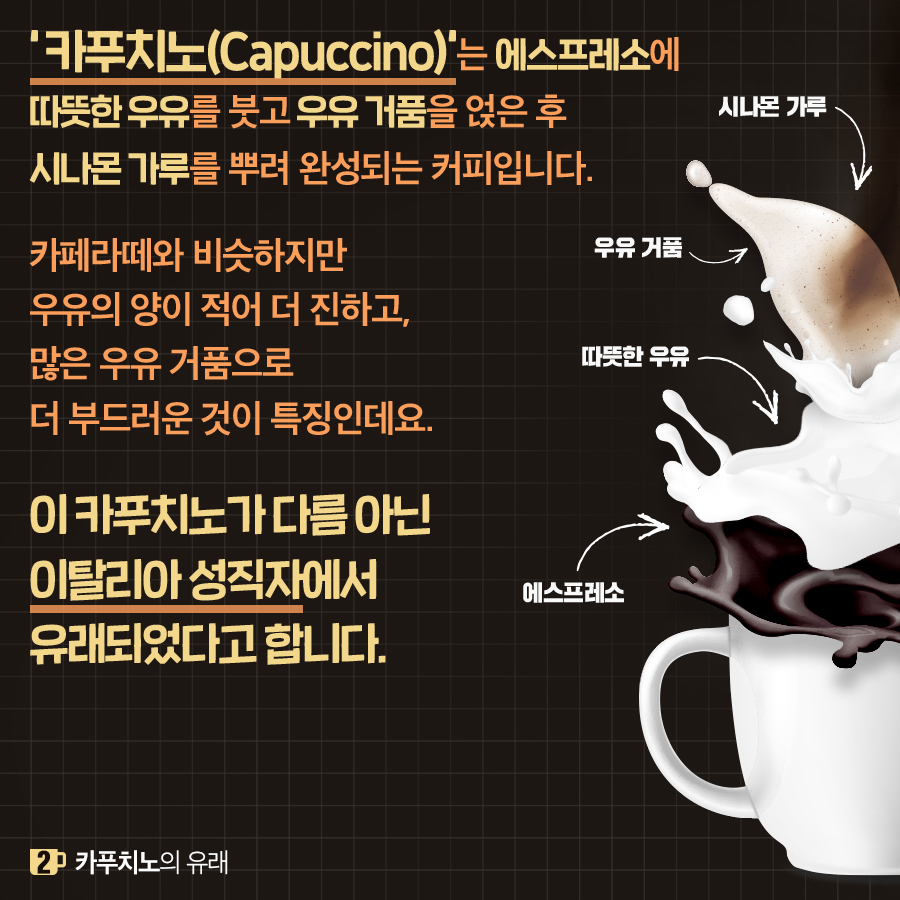 ‘카푸치노(Capuccino)‘는 에스프레소에 따뜻한 우유를 붓고 우유 거품을 얹은 후