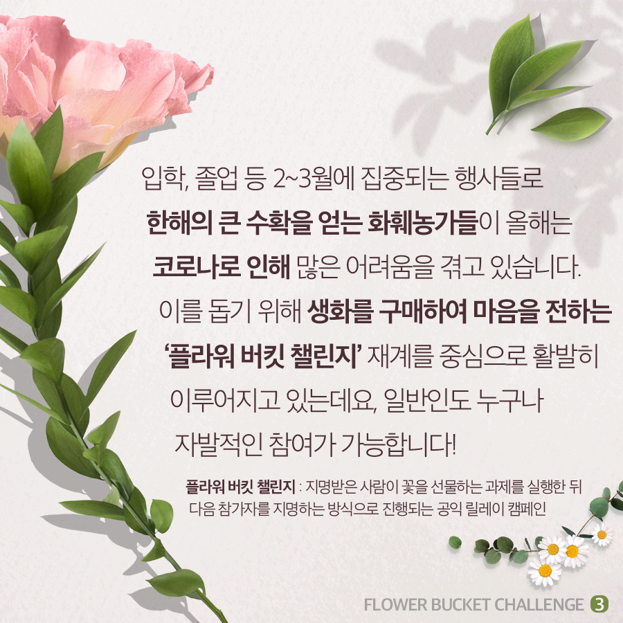 많은 어려움을 겪고 있습니다. 이를 돕기 위해 생화를 구매하여 마음을 전하는 ‘플라워 버킷 챌린지’가 재계를 중심으로 활발히 이루어지고 있는데요, 일반인도 누구나 자발적인 참여가 가능합니다!
