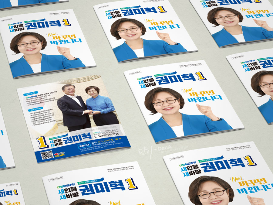 제21대 국회의원선거 더불어민주당 권미혁 후보 예비후보자홍보물을 디자인 및 제작 완료하였습니다.