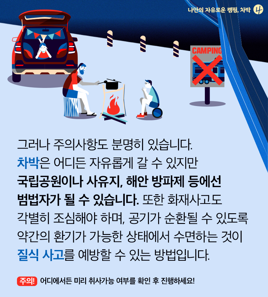 그러나 주의사항도 분명히 있습니다. 차박은 어디든 자유롭게