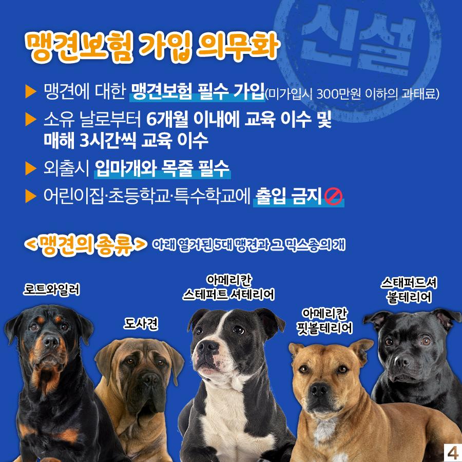 ▶ 맹견에 대한 맹견보험 필수 가입 (미가입시 300만원 이하의 과태료)