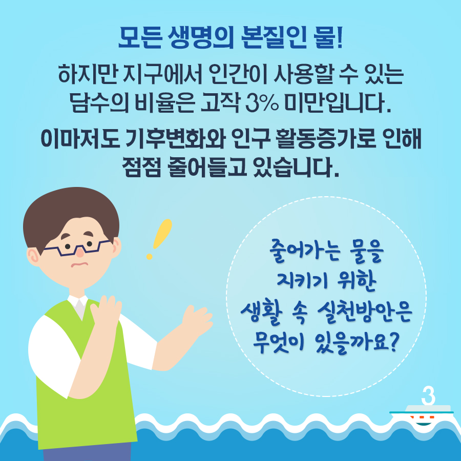 하지만 지구에서 인간이 사용할 수 있는 담수의 비율은 고작 3% 미만입니다.
