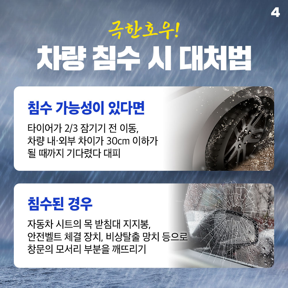 물이 차 오르면 차량 이동을 멈추고 즉시 탈출해야 합니다.