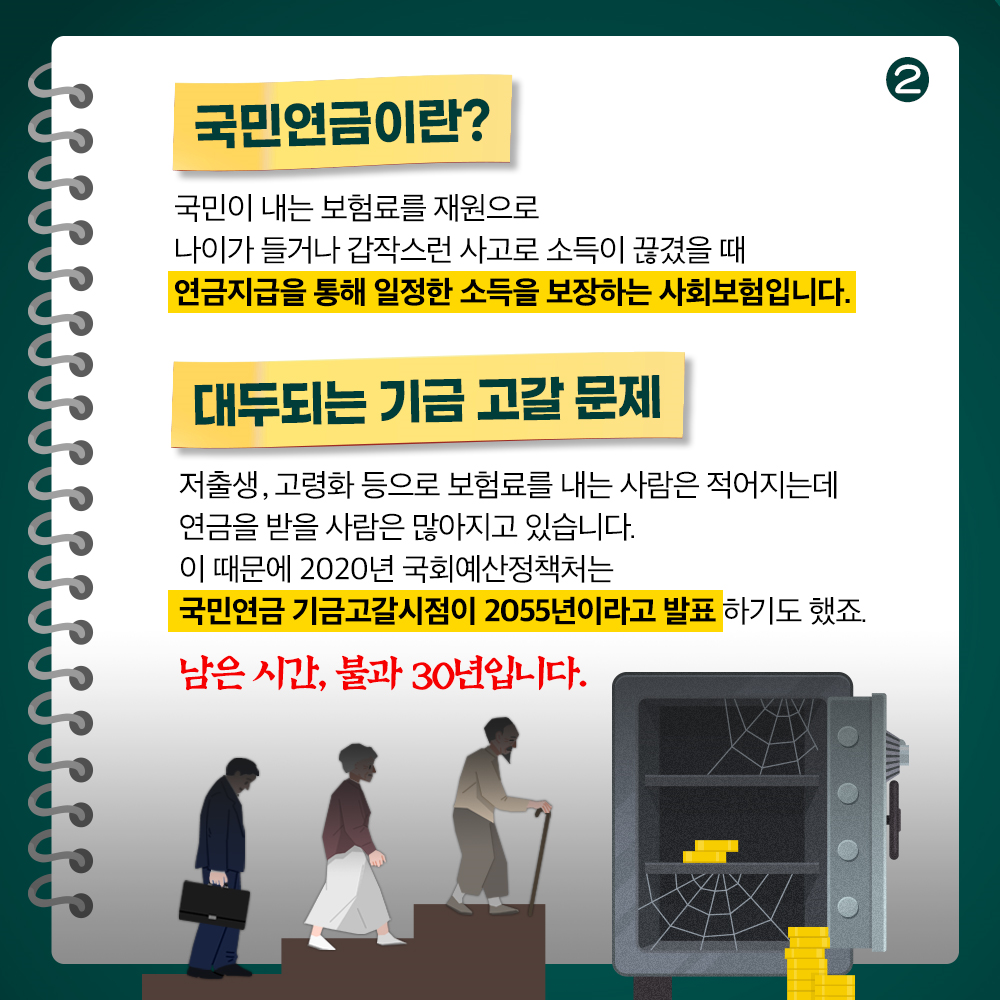 이때문에 2020년 국회예산정책처는 국민연금 기금고갈시점이 2055년이라고 발표하기도 했죠.