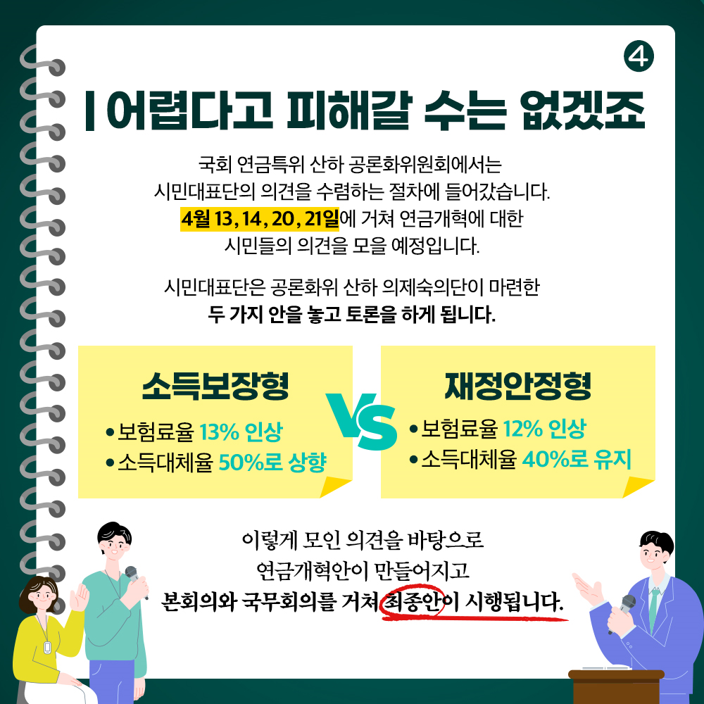 4월13,14,20,21일에 거쳐 연금개혁에 대한 시민들의 의견을 모을 예정입니다